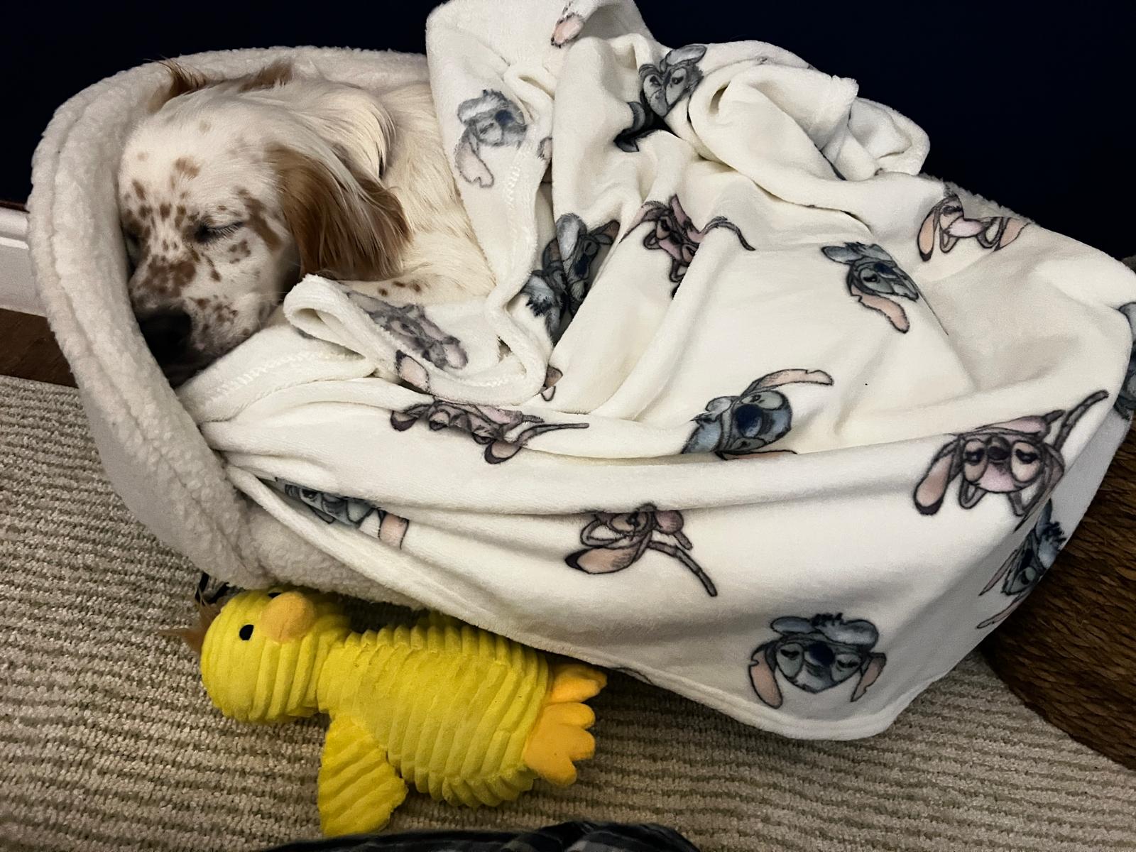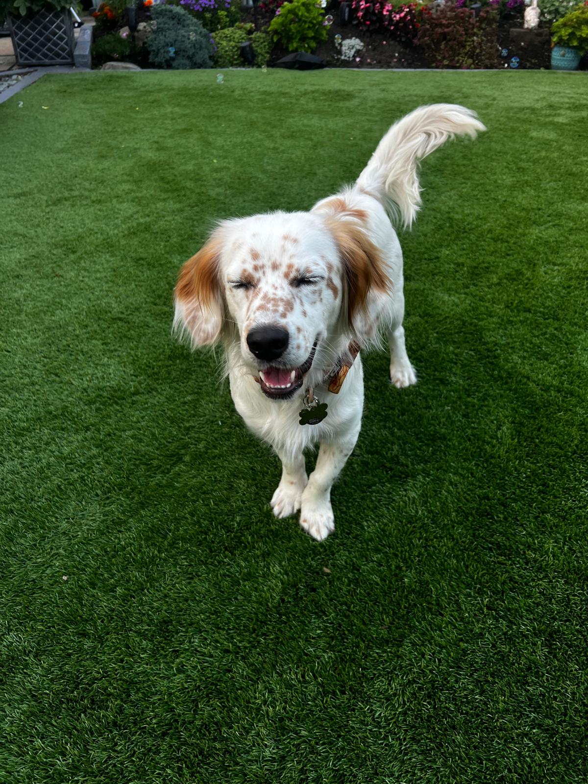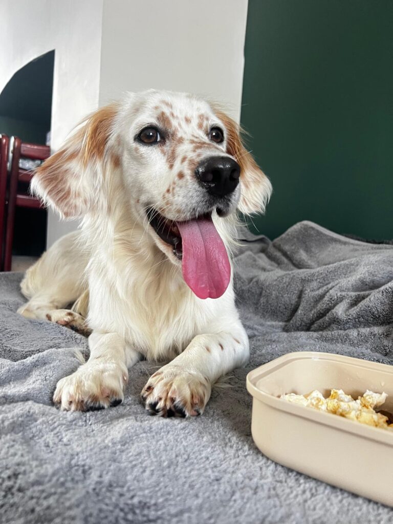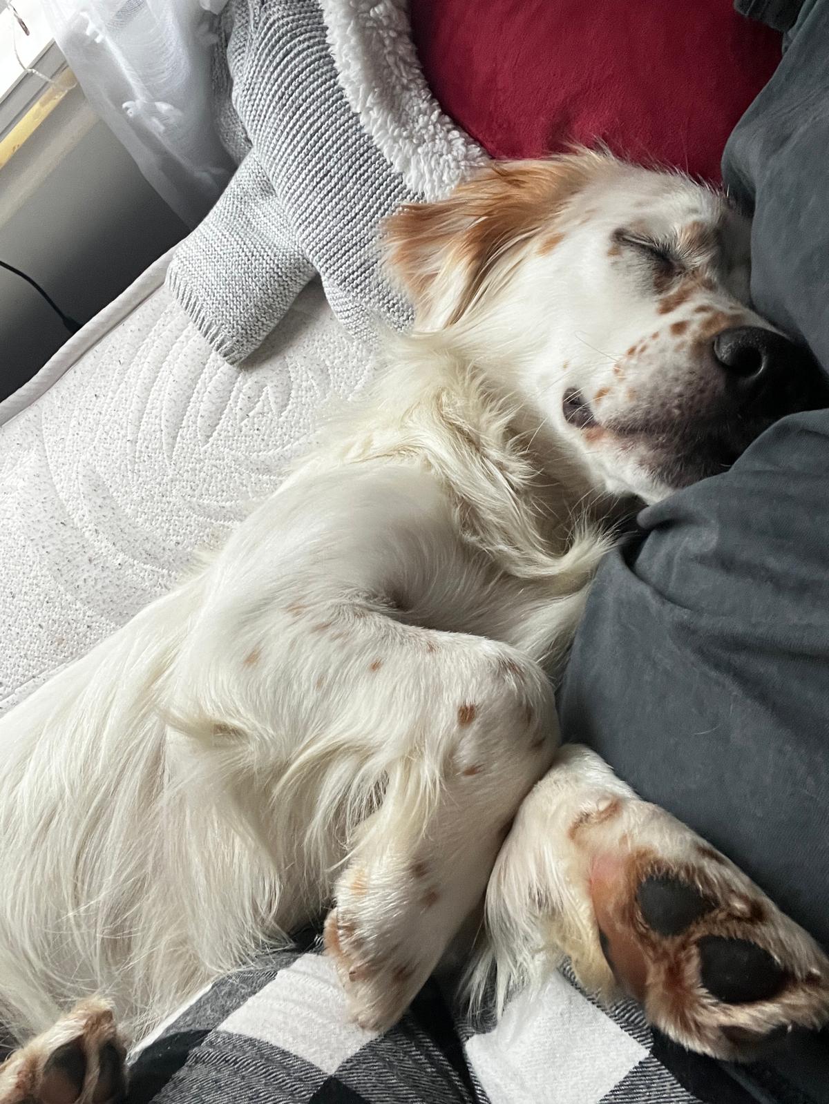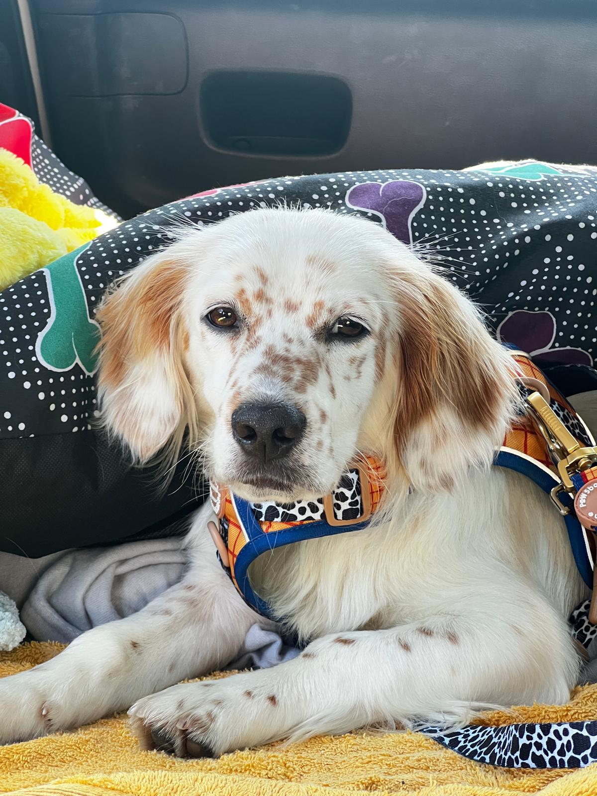 Lilo loves nothing more than cuddling up next to a human and having belly scratches. Quickly followed by zoomies around the house until he flops. Like a lot of setters, he can pull when on the lead so his lead training will need to be worked on as will his recall. His favourite place to go for walks is the beach and he will dig in the sand, bounce through the water and explore. He enjoys the company of a family dog that he visits and loves playing with her. As he is still a puppy, he loves his toys and likes to play tug of war and fetch, not always with his own toys! Lilo is also a foodie and particularly enjoys a slice toast and sausage treats as well as antler chews and bones.