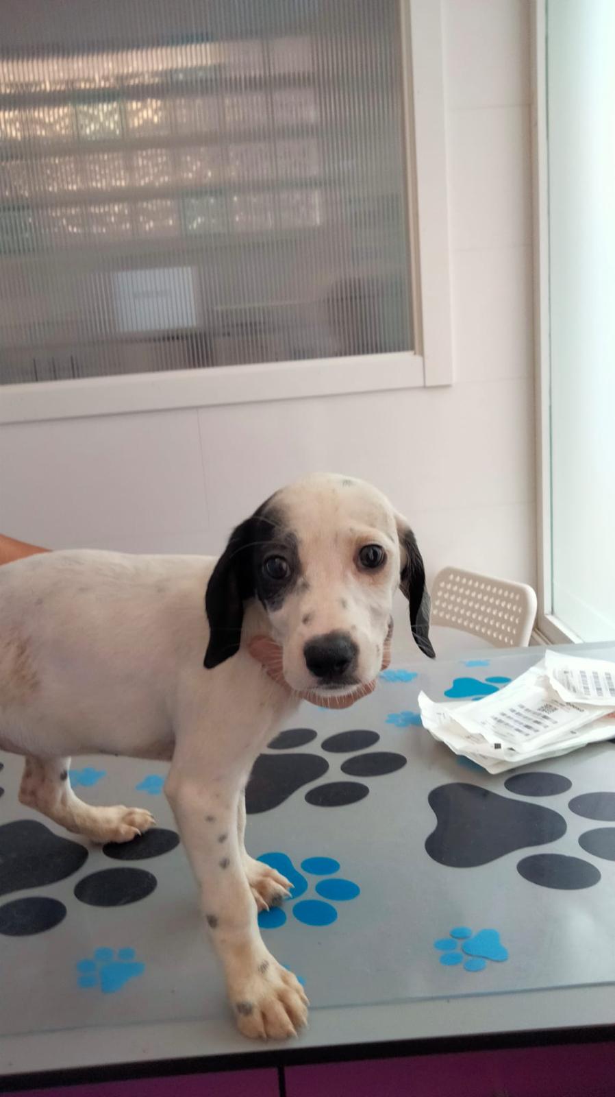 Minty is one of the female pups and is white with a black eye patch on her right eye.