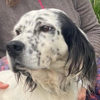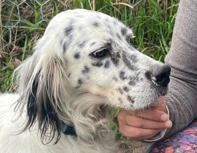 Ola is a beautiful male setter, another dog given up because he wasn’t suitable for hunting. He’s a smaller setter with a silky black and white coat.
