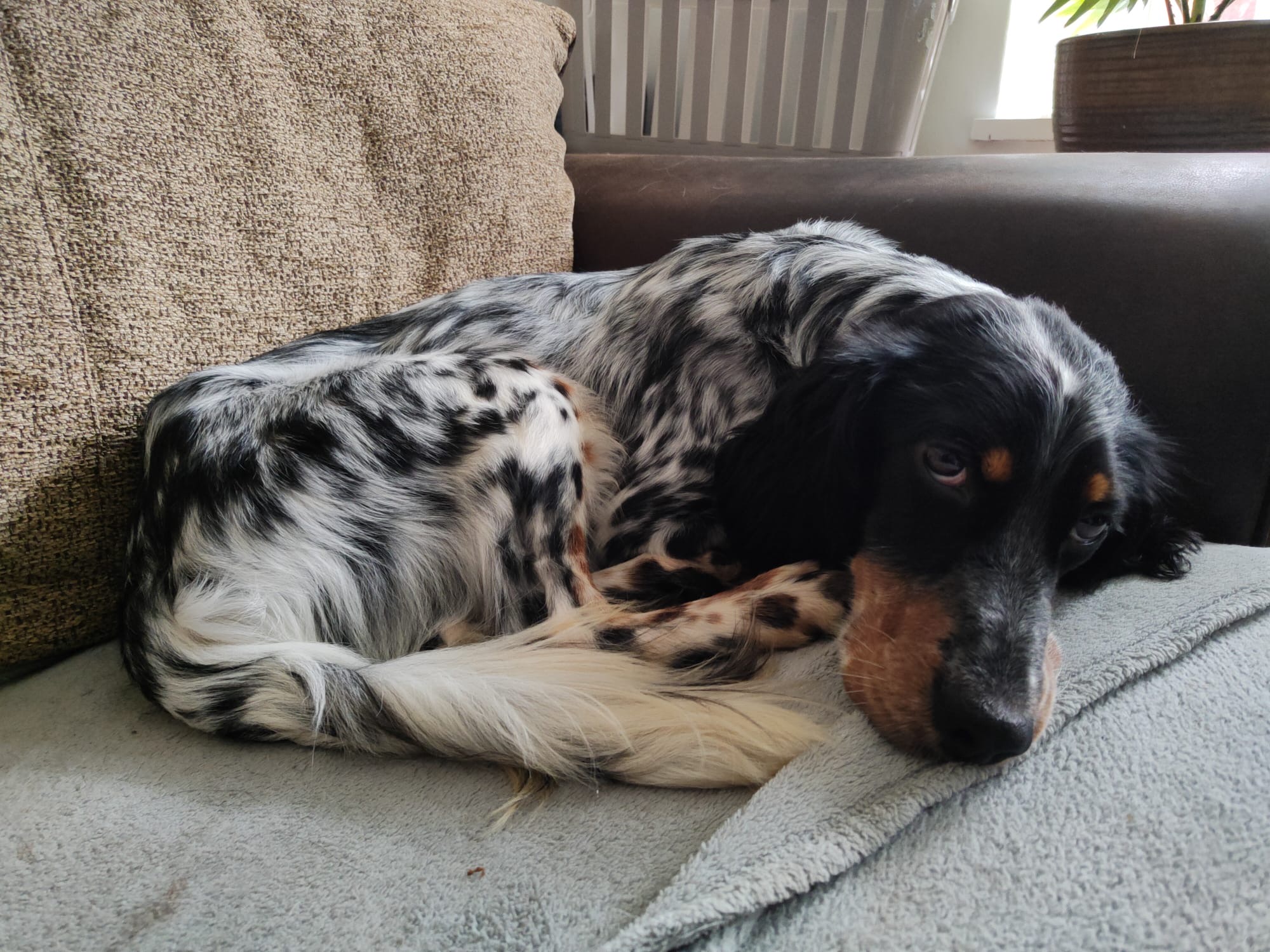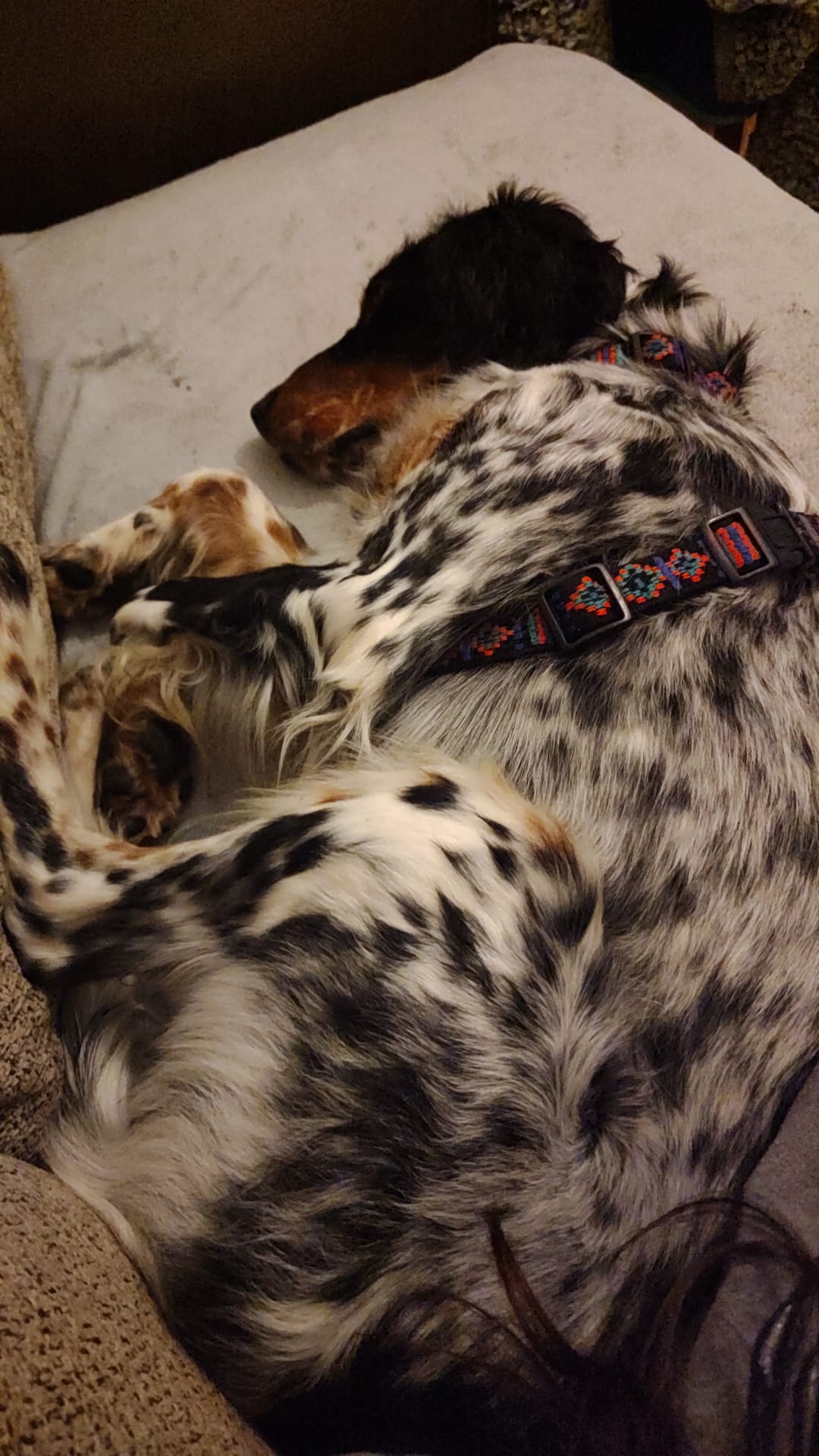 Olaf is a beautiful young tricolor setter. We were asked to help Olaf when we heard his hunter wanted to get rid of him ASAP, and we dreaded the thought of what would happen to him if we didn’t step in. He was already wearing an E-Collar in the photos we were sent of him, so we knew the treatment Olaf was getting wasn’t kind.