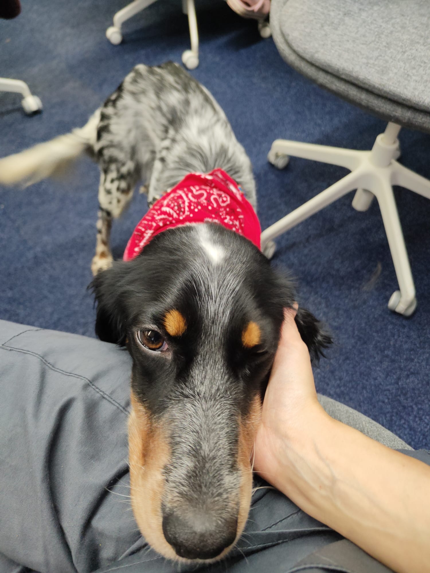 With other dogs, Olaf tends to be quite submissive and would benefit from some gentle support to help build his confidence. He currently goes into work with his fosterer, he curls up in his bed beside her desk and sleeps after he’s had a good walk. He loves meeting people in the office and soaks up all the fuss and cuddles.