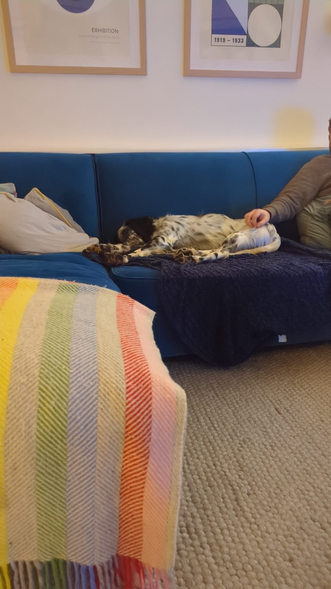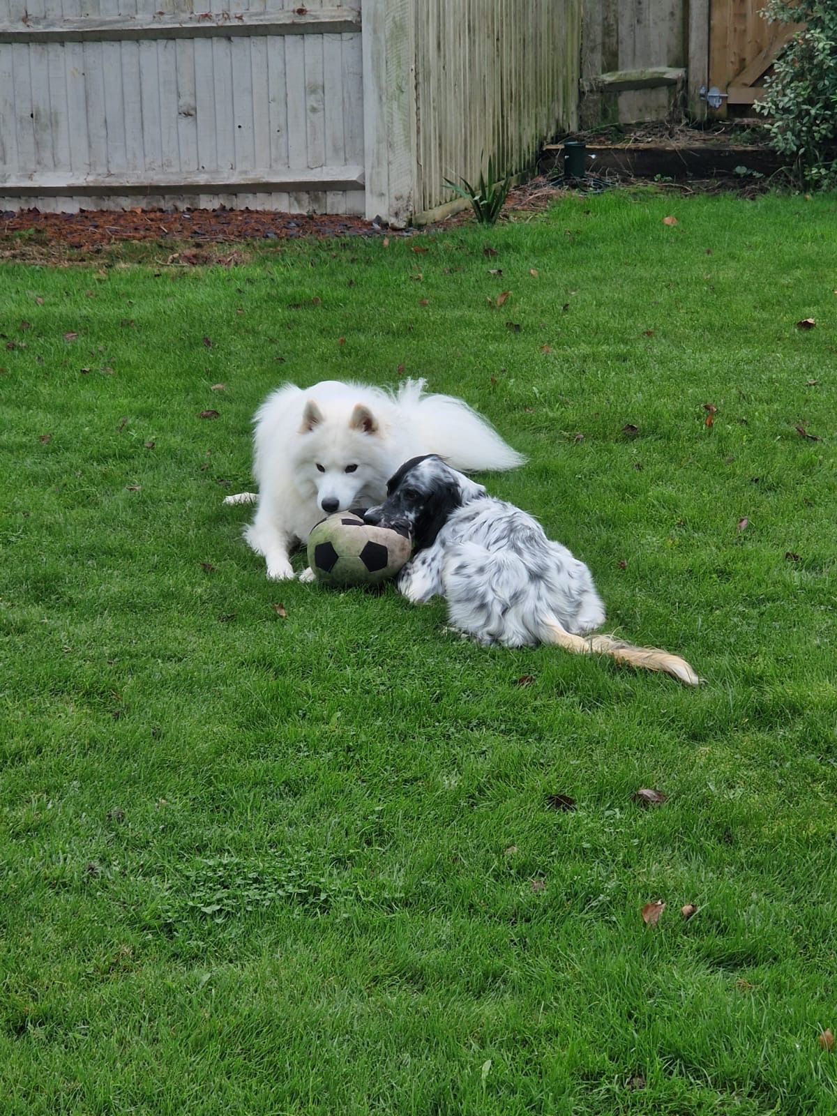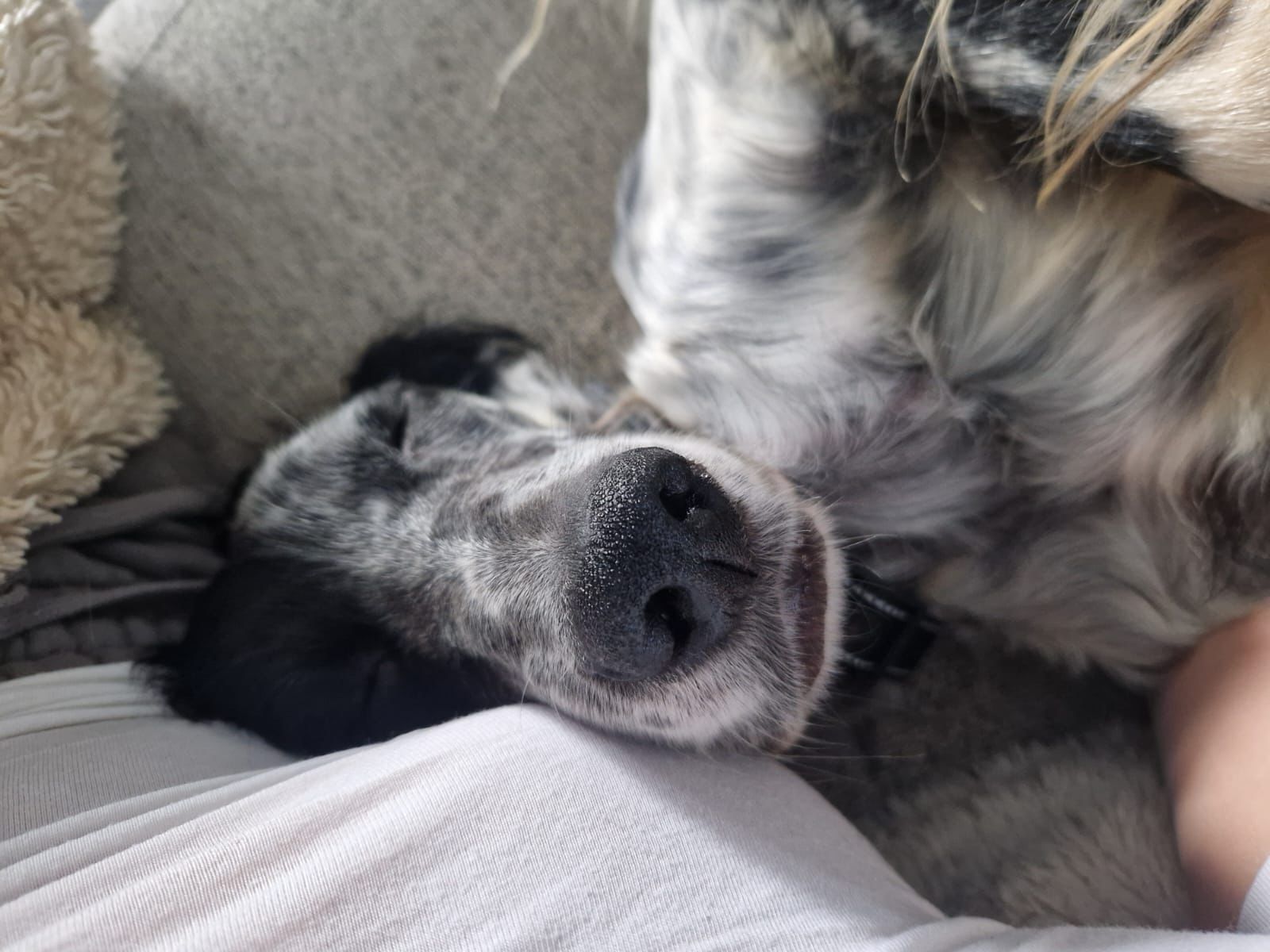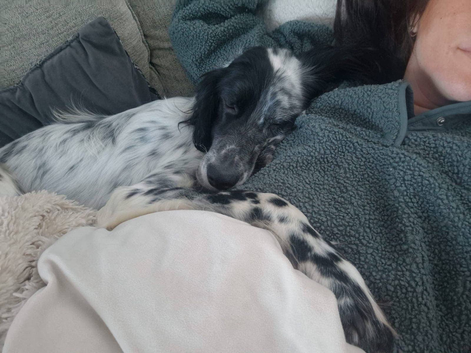 Tae is fantastic with other dogs and plays wonderfully with them. He’s also a complete cuddle bug who adores snuggling up with his favourite people. He tends to bond more quickly with women.