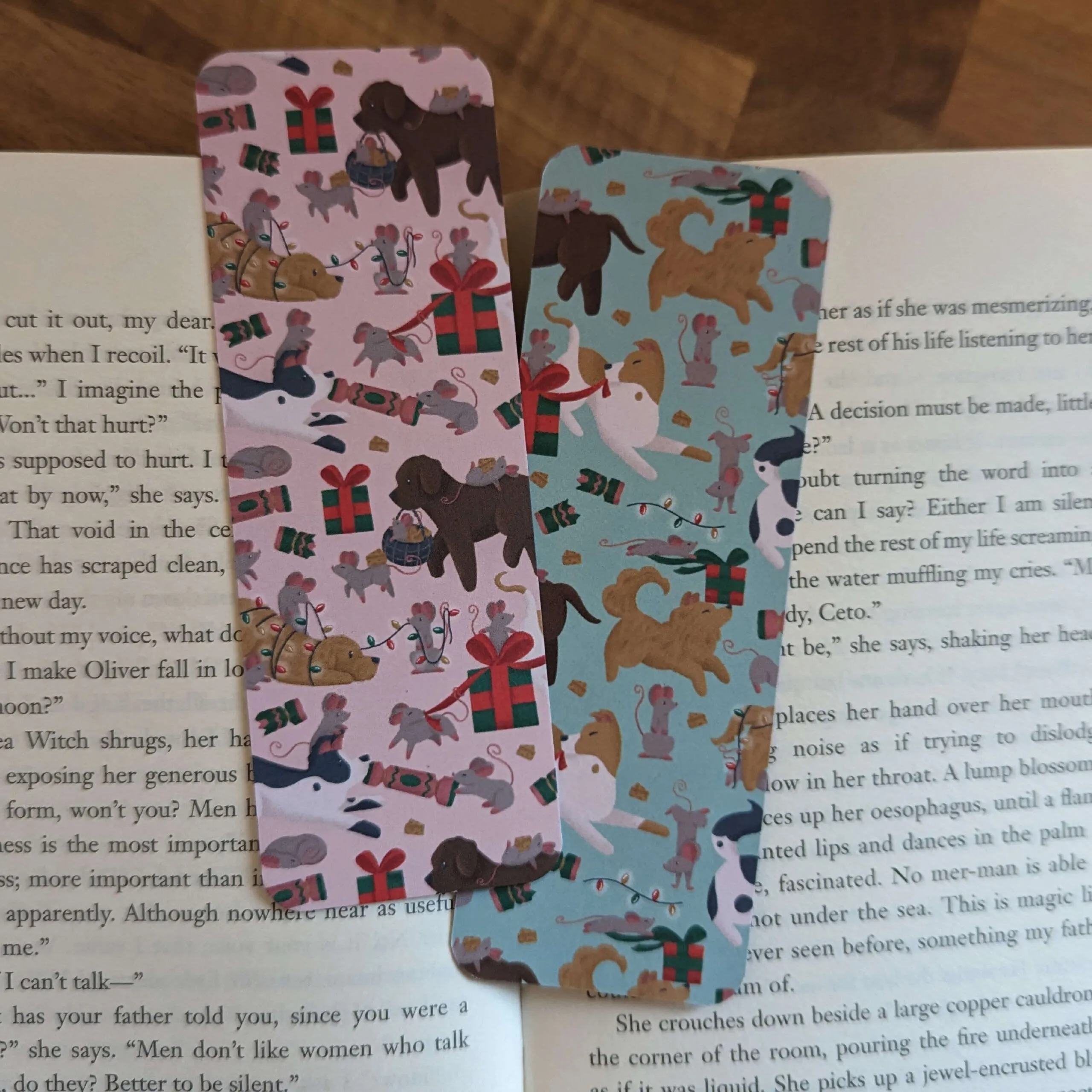 This double-sided dog bookmark features a unique festive print of a group of mice and pups getting ready for Christmas! With lights to be strung, presents to be wrapped, and cheese to be consumed, these pups are doing their best to help with festive preparations (although really, they might just be making more mess…)