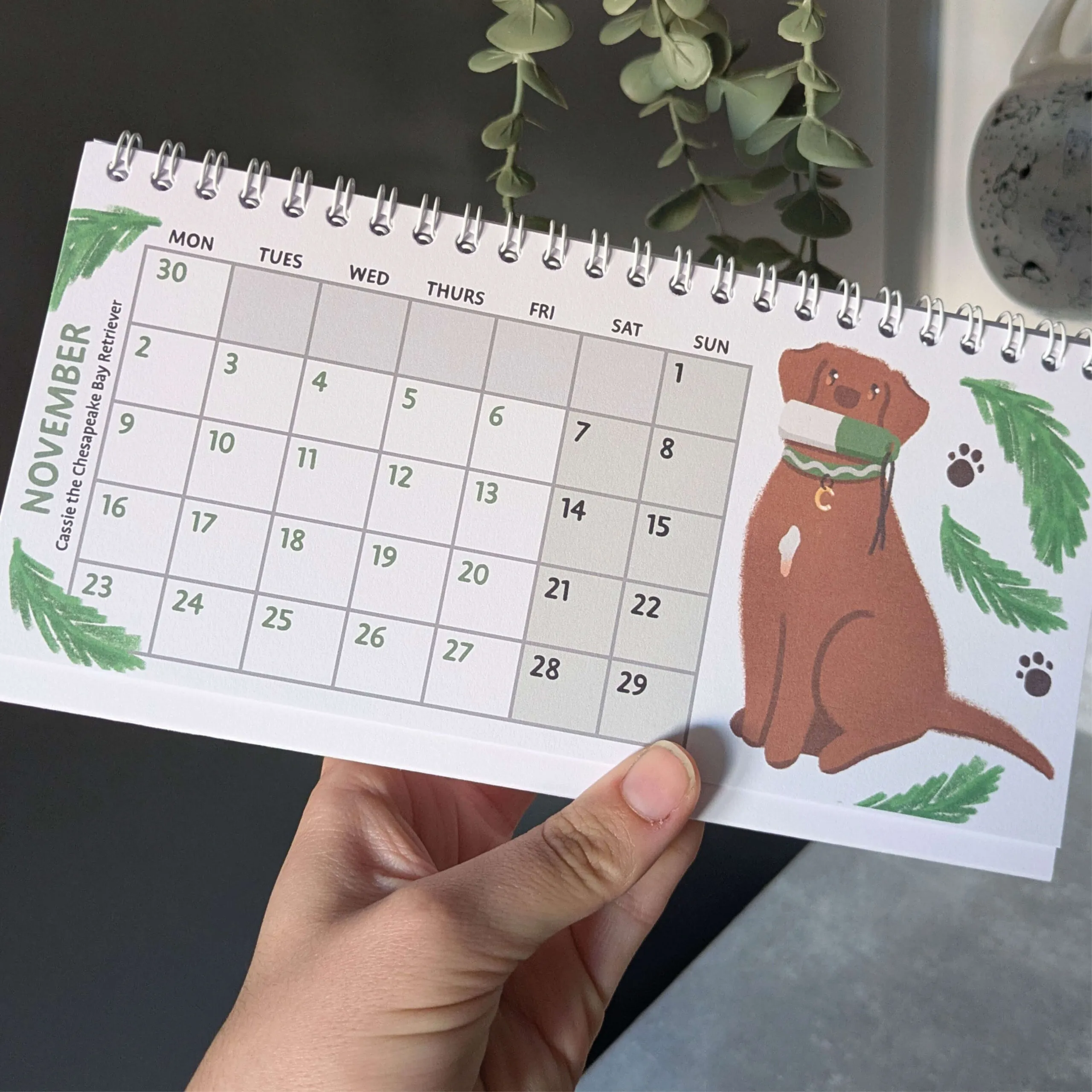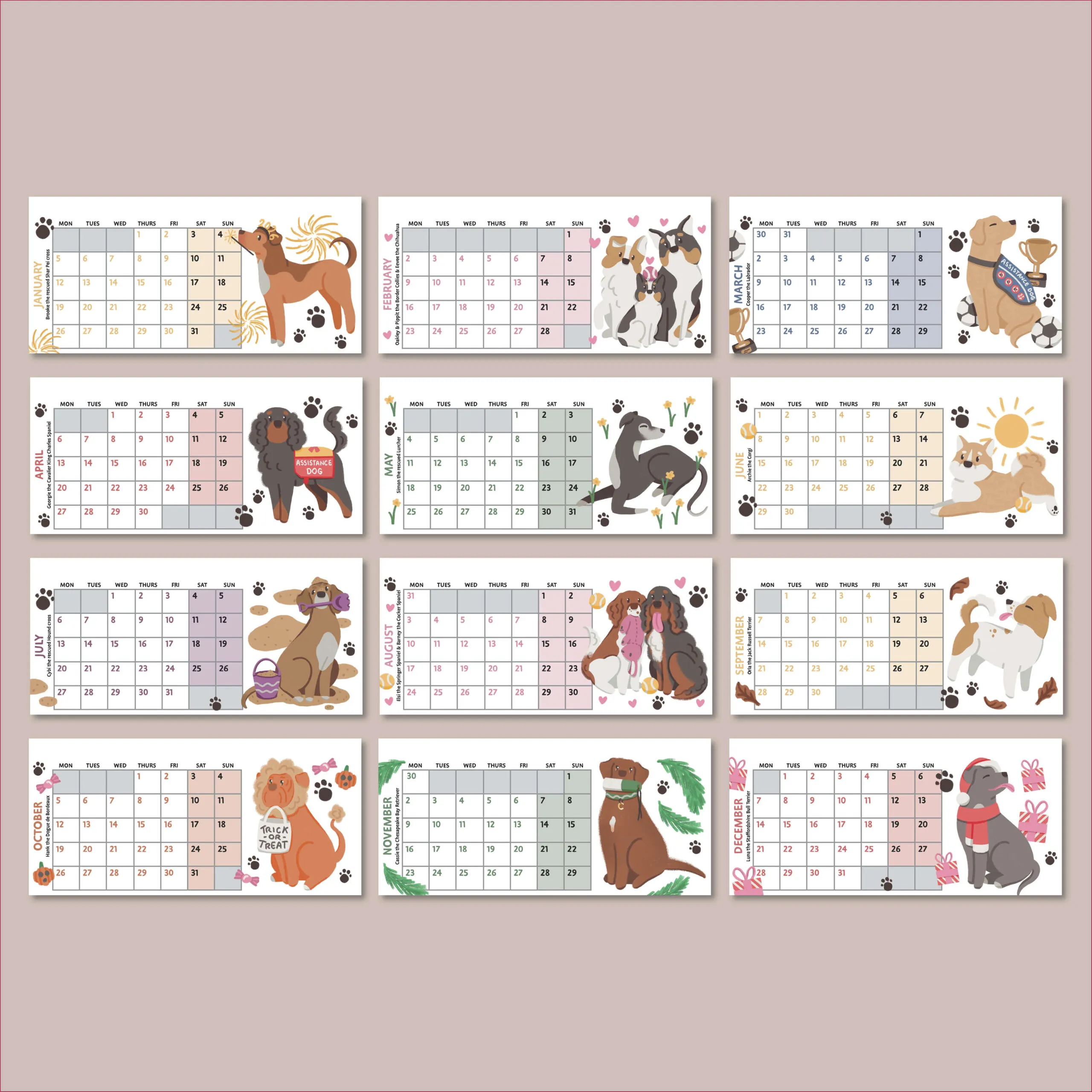 With 12 hand-drawn designs inspired by real dogs to guide you through the year, this mini desk calendar will look perfect on your shelf or workspace. With lovely single-sided, uncoated pages for writing notes on, it’s the handy little desk calendar every busy dog family needs! Simply gently fold your calendar, and it is heavy enough to stand nicely on any flat surface.